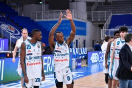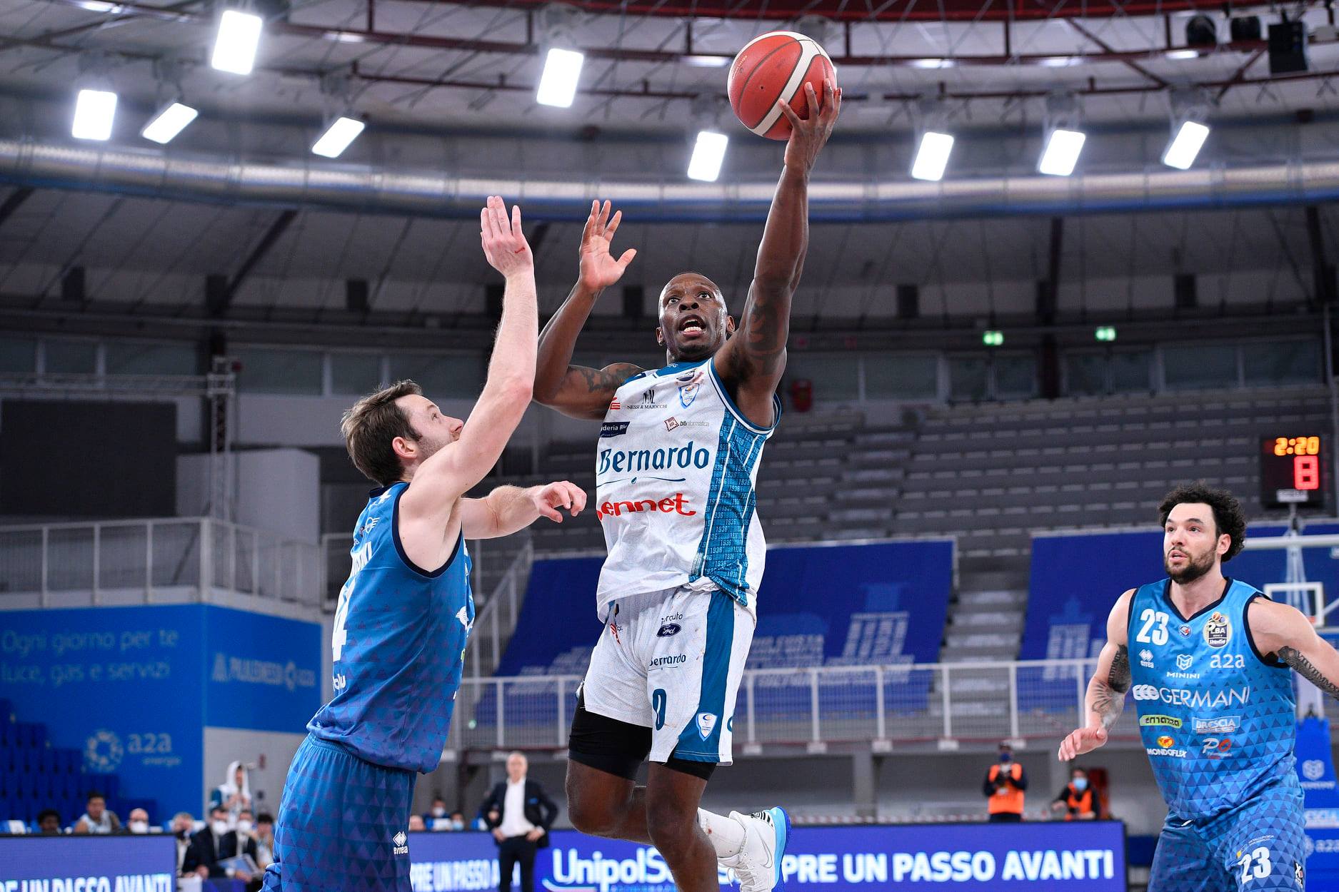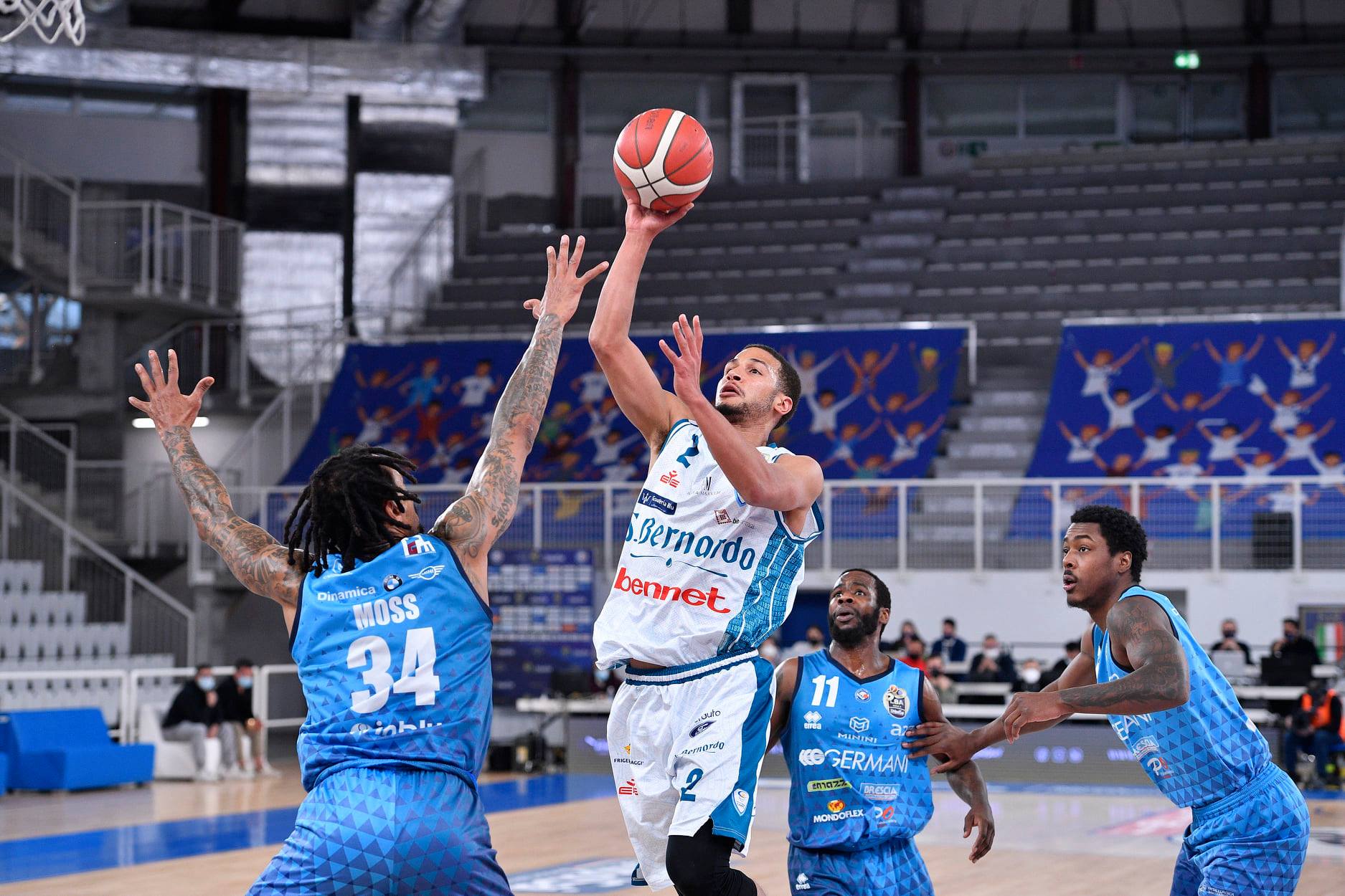 Una “bomba” pesante di Leunen lancia i biancoblu sul meritato +6 di vantaggio, costringendo coach Buscaglia a fermare il gioco. 45-51 al 26’. L’Acqua S.Bernardo spinge il piede sul pedale dell’acceleratore e con una schiacciata di Bayehe, ben trovato da Johnson, riesce ad azzannare il +8. Nel finale di terzo periodo, Gaines, nel frattempo a quota 20 punti, trascina i suoi avanti di tre possessi pieni. A quarantadue secondi e spiccioli dal termine, un fallo antisportivo di Radic permette alla Germani di limare il proprio svantaggio, chiudendo al 30’ sotto solamente di sette punti. 50-57 a dieci dalla fine.