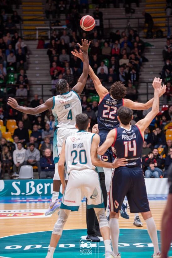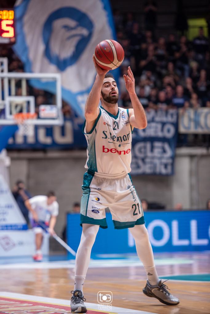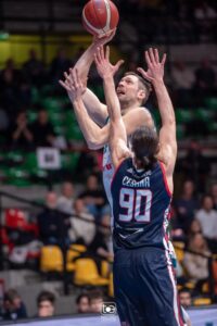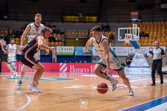 Quarta frazione al cardiopalma: testa a testa tra Gajic e Baldi Rossi, che infiamma il palazzo con la sua prima bomba (60-65). Il solito McGusty in penetrazione fa la voce grossa per gli ospiti, poi Bucarelli timbra da fuori (63-67). Sale in cattedra Baldi Rossi per il -1 (66-67). Severini impatta dalla lunetta, poi Cesana ne mette cinque, ma è pronto Bucarelli con tripla e canestro (73-72). Miaschi da tre, ma pareggia Hunt da sotto su assist di Rogic (75-75). Ancora Miaschi da fuori, poi McGusty per il +5 (75-80). Nel finale i biancorossi gestiscono e vincono per 79-89.