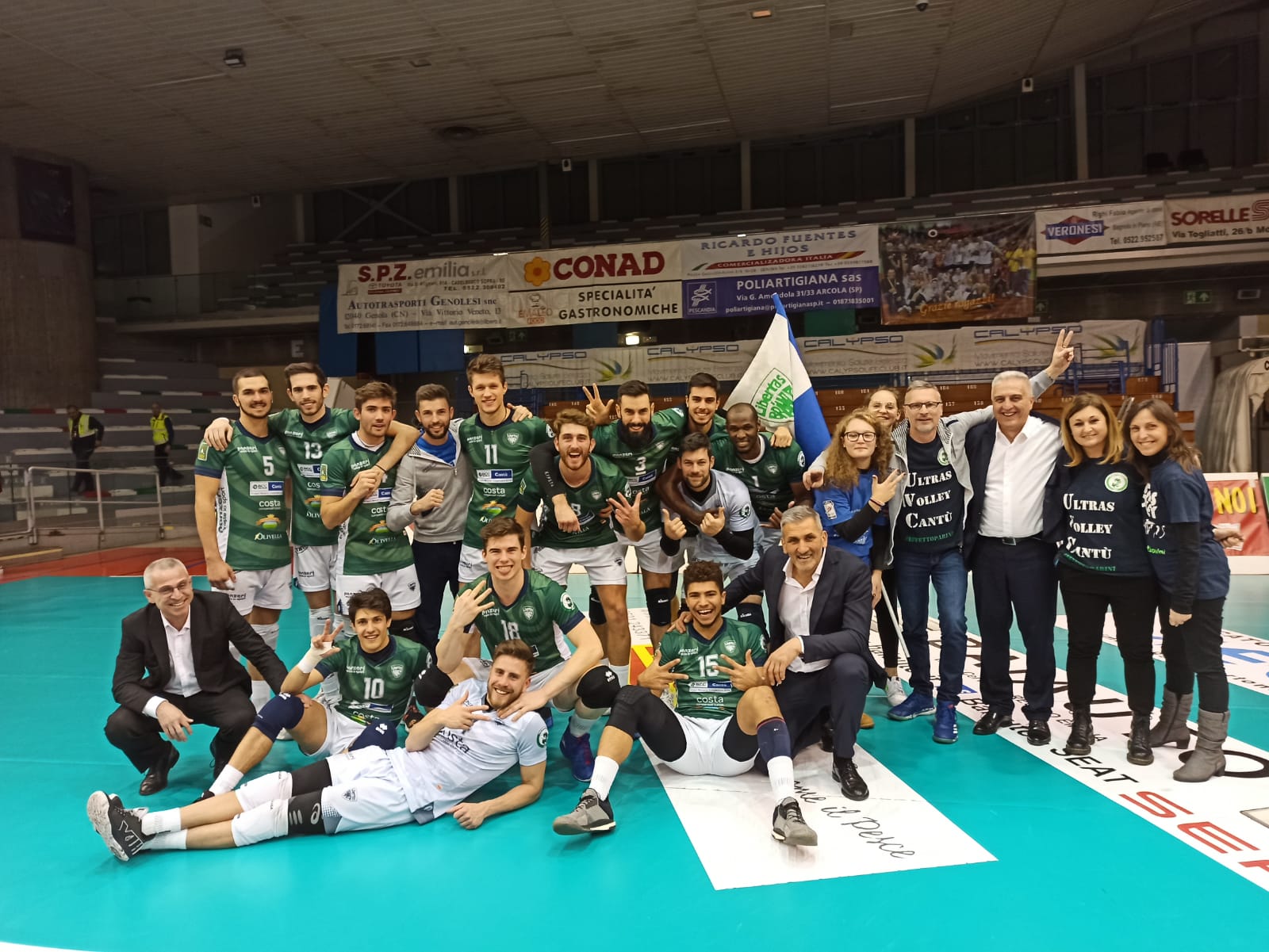 REGGIO EMILIA - La prima partita del 2020 è positiva: il Pool Libertas soffre, ma porta a casa tre punti dal PalaBigi di Reggio Emilia contro i padroni di casa della Conad, che significano aggancio in classifica. Tre set su quattro finiscono ai vantaggi, è lotta di bravura tra i due opposti (per Magnani 37 punti con il 58% in attacco, Raydel Poey risponde con 25 punti e il 52%), ma alla fine del match sono i canturini a gioire.