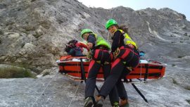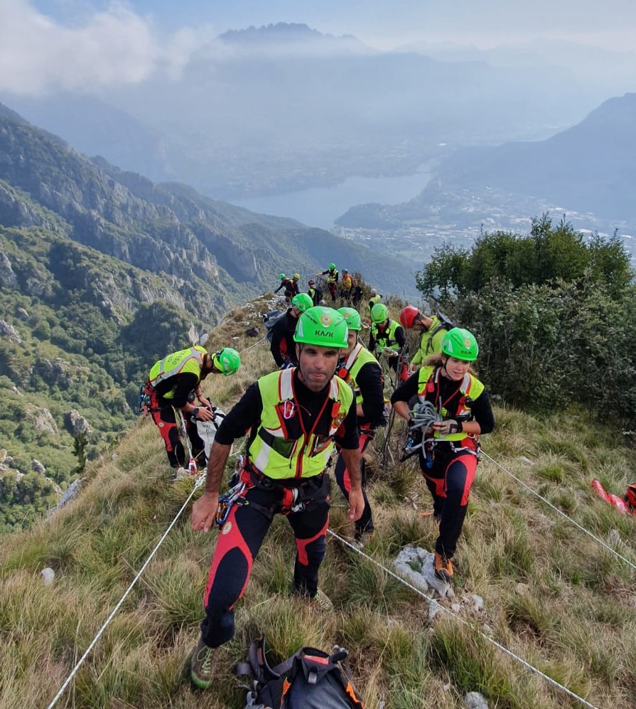 Nella simulazione di soccorso a due cordate, il primo capocordata cade e rimane ferito: bisogna recuperarlo in parete e salvare anche il compagno assicurato con lui. Arrivati in cima, i tecnici hanno allestito due linee di calata con diverse tipologie di manovre tecniche di soccorso: calata con ripresa e calata con piastra totem. Raggiunto il ferito, rappresentato da un figurante, un tecnico e un sanitario hanno condizionato il paziente e lo hanno imbarellato. Hanno raggiunto e preso in carico anche il compagno e li hanno portati alla base della parete, per poi proseguire con barella portantina nel bosco fino alla località San Tommaso.
