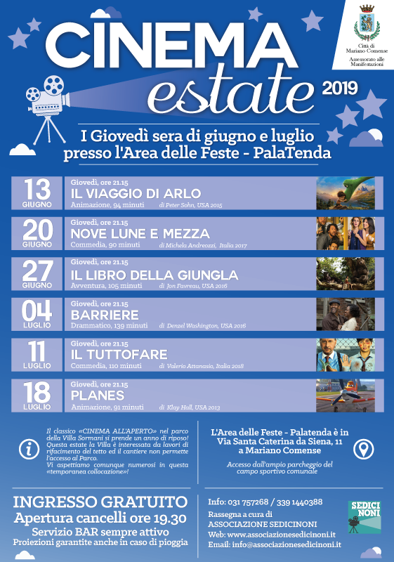 MARIANO COMENSE – Tutto pronto per la rassegna di cinema estivo. Nei prossimi mesi di giugno, luglio all'Area delle Feste - Palatenda di Mariano Comense in via Santa Caterina 11, ospiterà sei proiezioni cinematografiche organizzate dal comune di Mariano Comense in collaborazione con l'associazione SediciNoni (a destra la locandina, clicca per ingrandire e leggere al meglio).