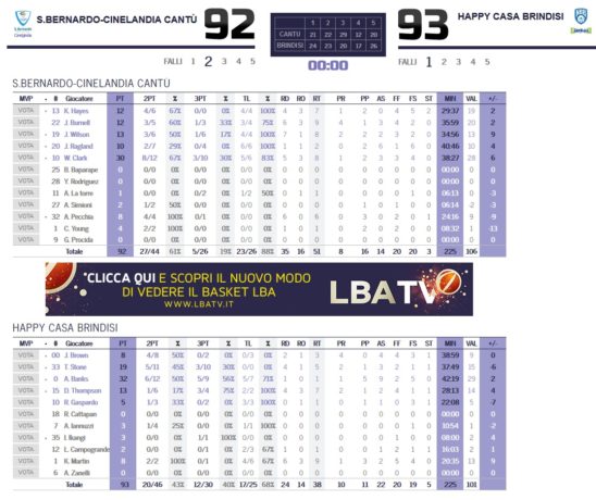 Brindisi: Brown 8, Banks 32, Martin 8, Zanelli n.e., Iannuzzi 3, Gaspardo 5, Campogrande 2, Thompson 13, Cattapan n.e., Stone 19, Ikangi 3. All. Vitucci.