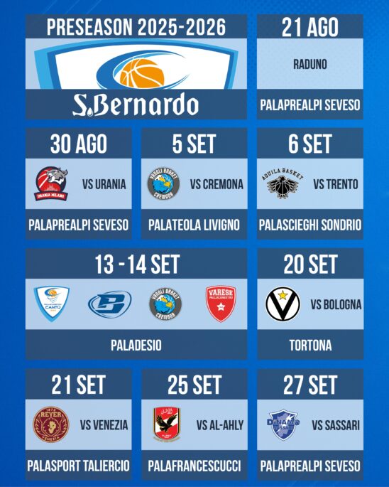 CANTÙ - È ufficiale il programma del precampionato dell'Acqua S.Bernardo. Cantù inizierà il percorso di avvicinamento alla prossima stagione giovedì 21 agosto, quando giocatori e staff si ritroveranno al Palaprealpi di Seveso per il raduno ufficiale.