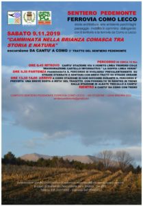 CANTÙ - Per il giorno 9 novembre il Comitato sentiero Pedemonte ferrovia Como-Lecco organizza un'escursione guidata da Cantù a Como, una camminata nella Brianza comasca tra storia e natura, sullo sfondo la ferrovia Como-Lecco.