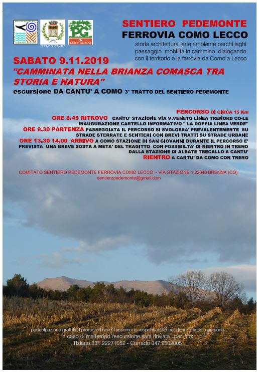 • ore 8.45 ritrovo alla stazione di Cantù via V. Veneto - ferrovia Como Lecco- per l'inaugurazione alla presenza dell'Amministrazione Comunale di Cantù del tabellone informativo "La doppia linea verde, il sentiero Pedemonte e la ferrovia Como-Lecco" progetto realizzato dai ragazzi del Liceo Fermi in collaborazione con l'associazione Legambiente Cantù finanziato dalla Fondazione Comasca e Yuoth Bank