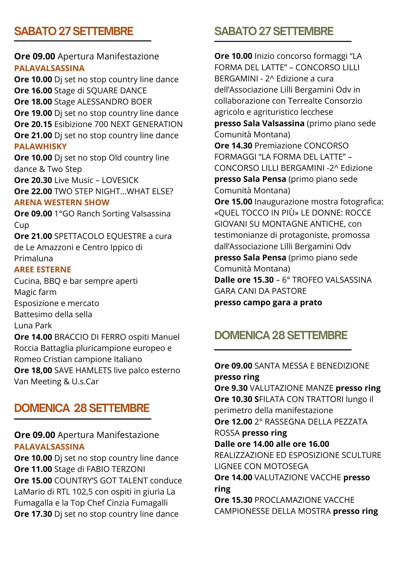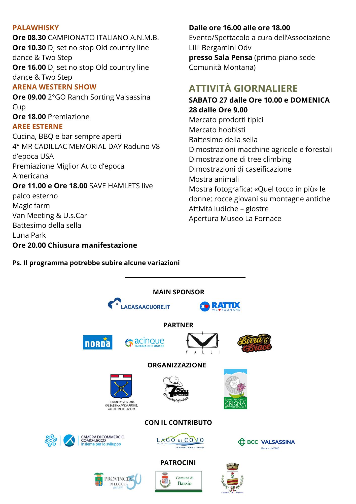 L’Arena Western Show ospiterà il Ranch Sorting Valsassina Cup, spettacoli equestri e momenti dedicati al movimento dei cavalli. Le aree esterne offriranno cucina BBQ, luna park, battesimo della sella, esposizioni di auto americane d’epoca (con il Mr Cadillac Memorial Day) e concerti all’aperto.